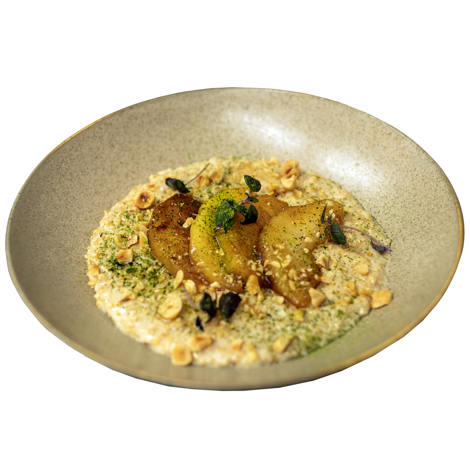 Creamy Matcha Porridge, Caramelized Apple, Hazelnut, Cress, Honey